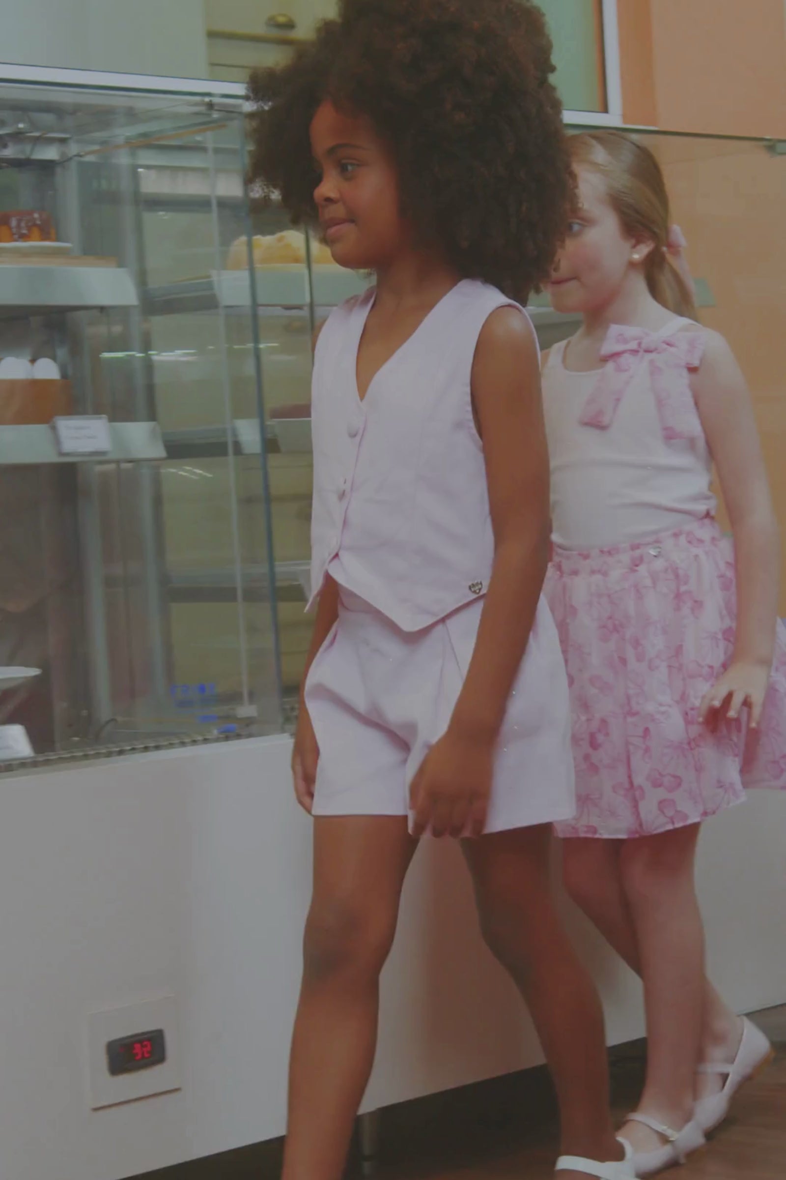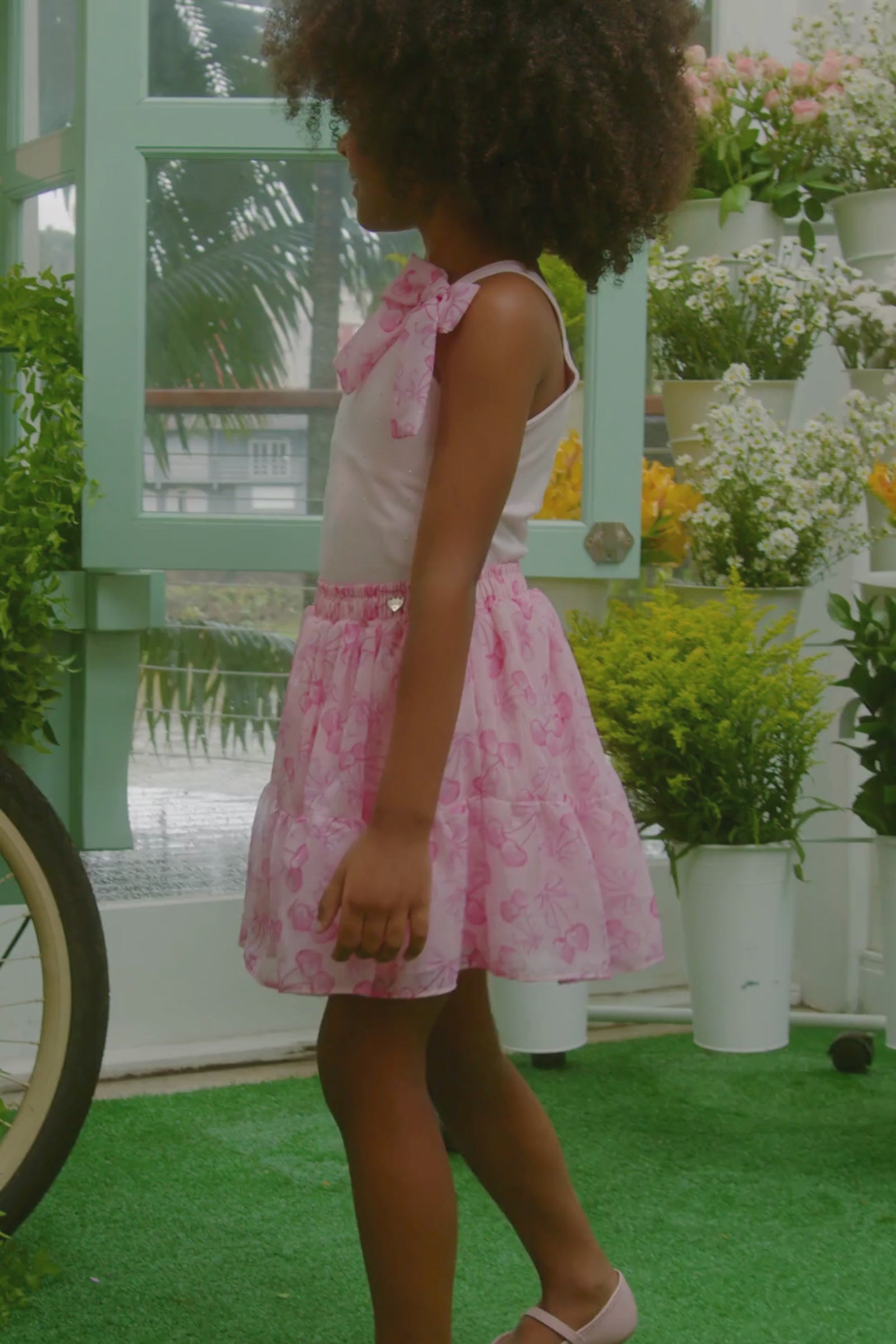 Para um look delicado e charmoso, o Conjunto Kukie Charm é a escolha ideal. A blusa pink em cotton possui alças com laços e aplicação de strass, adicionando um toque de brilho. A saia em chiffon brilho, com shorts embutido, possui uma estampa de cerejas e flores, completando o visual com leveza e estilo para as meninas.